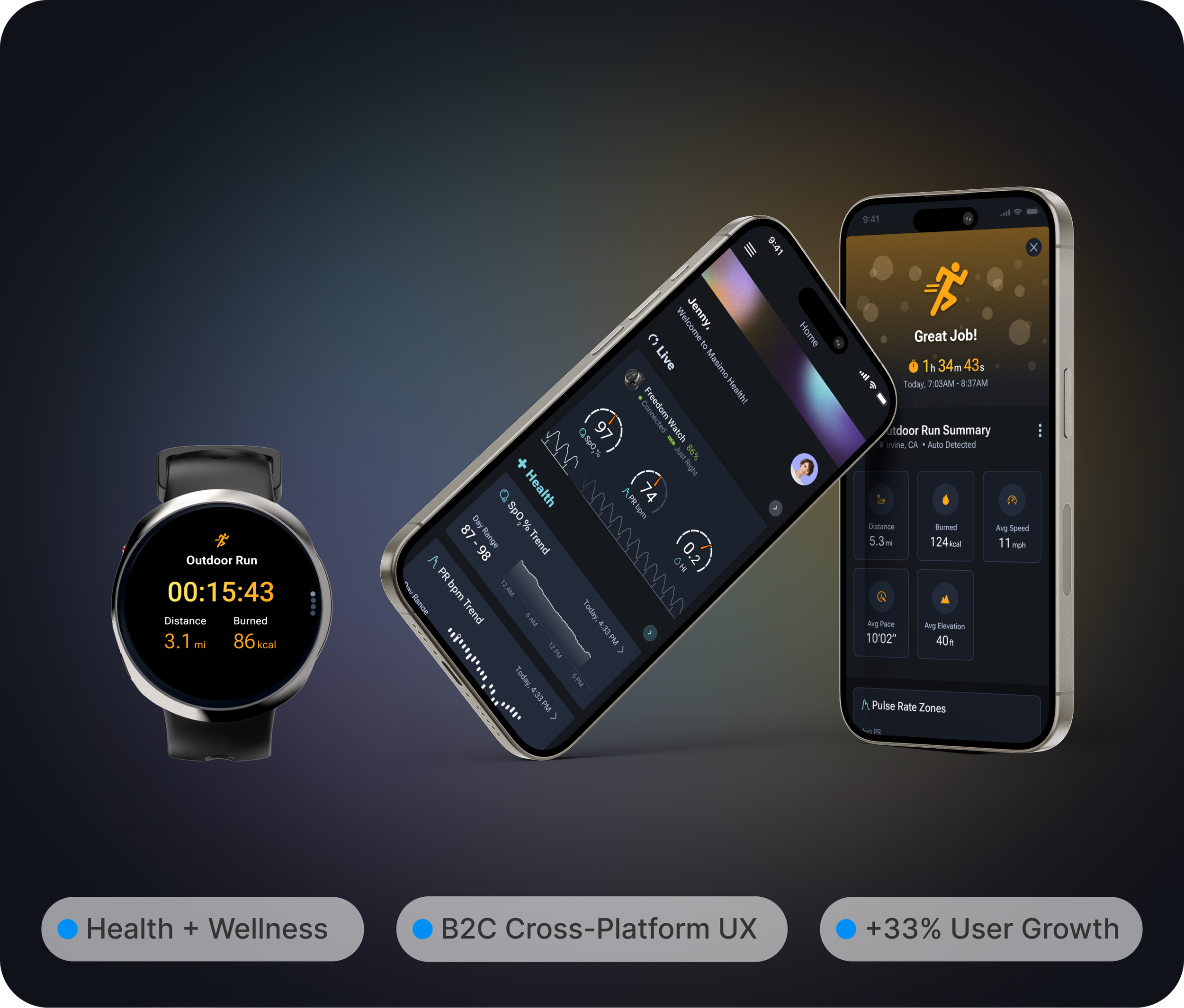 Led the end-to-end redesign of a B2C health tracking system, executing 12 core features across mobile and smartwatch with a seamless cross-platform experience while establishing a scalable cross-platform design system.