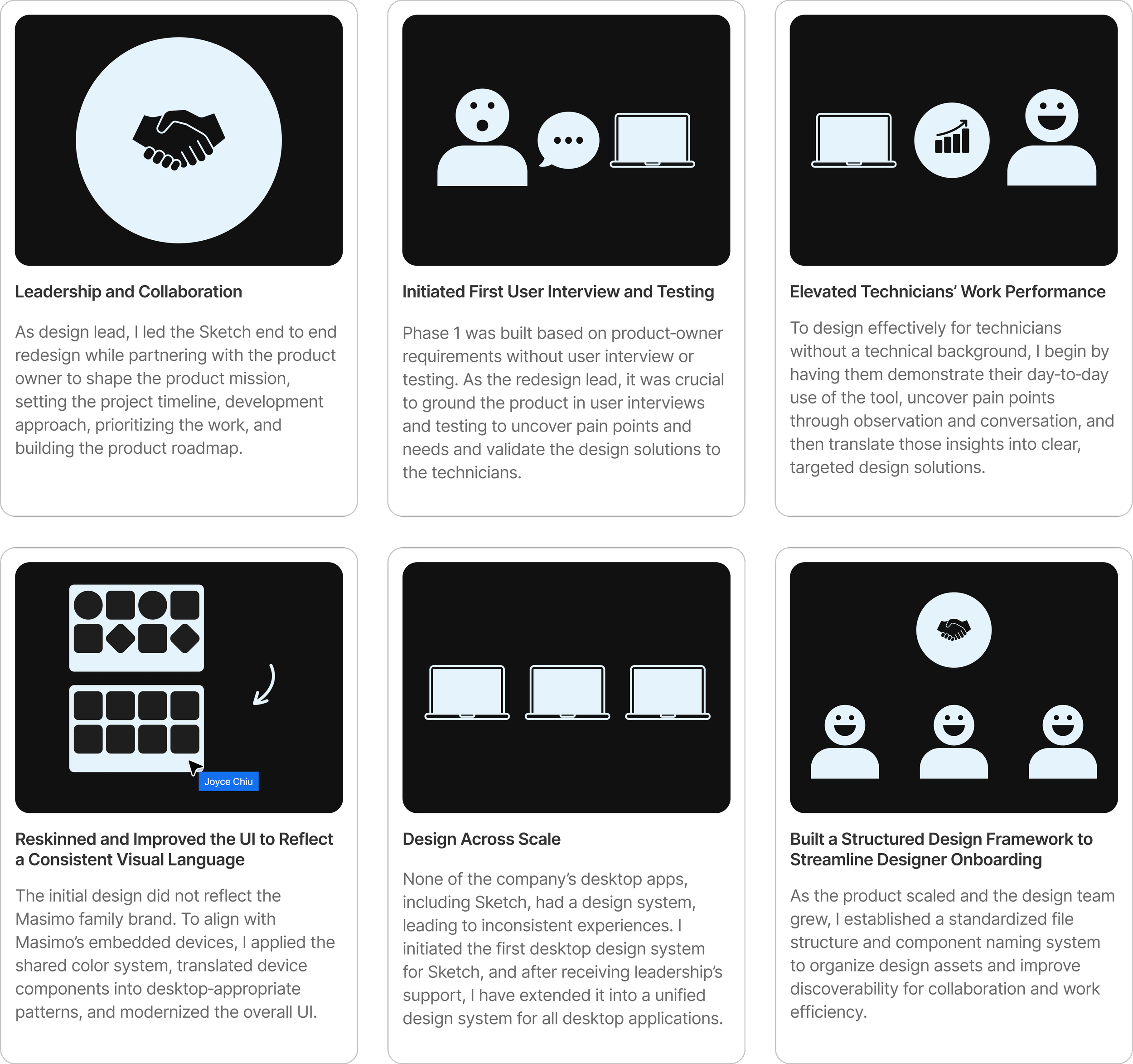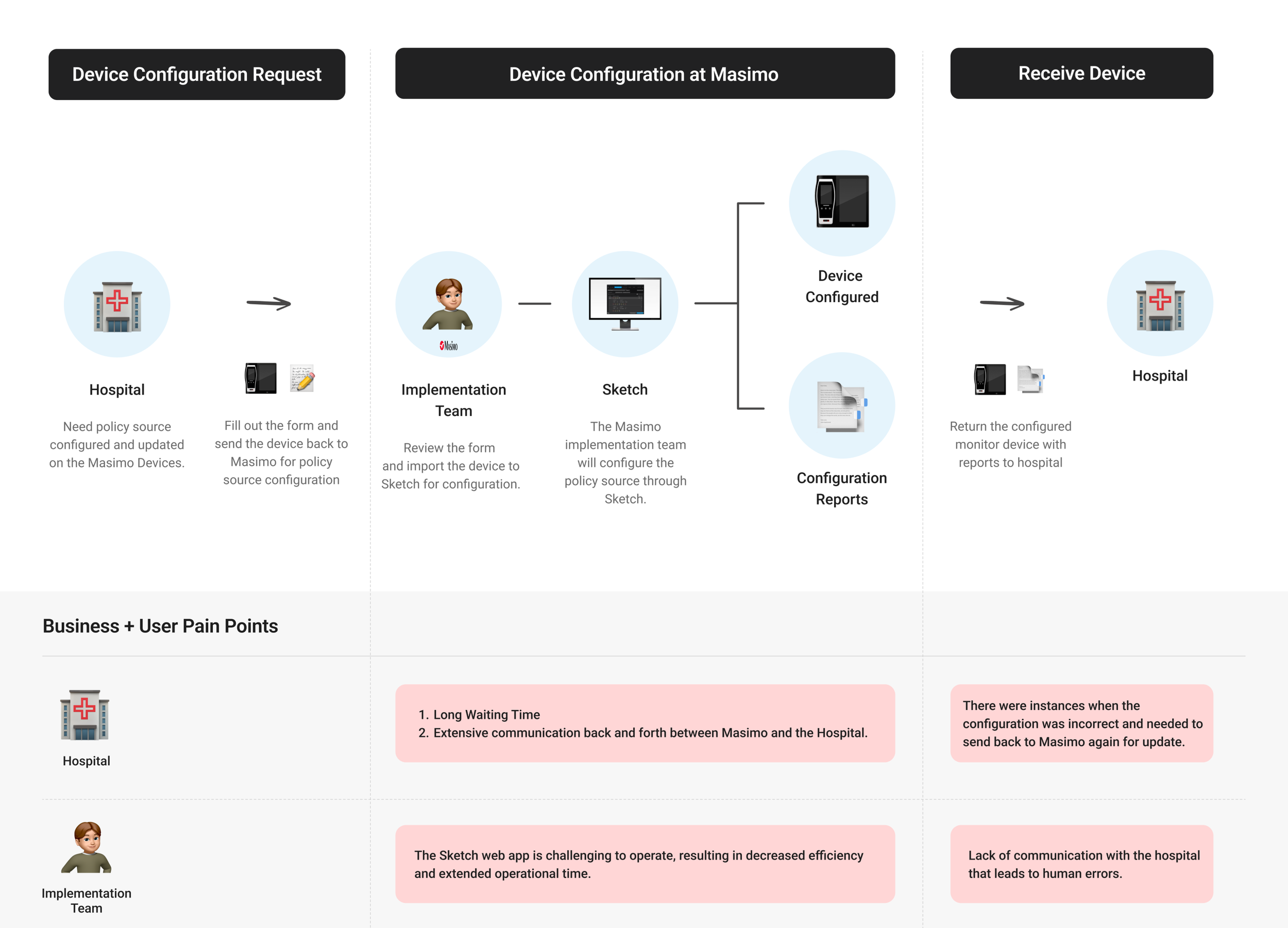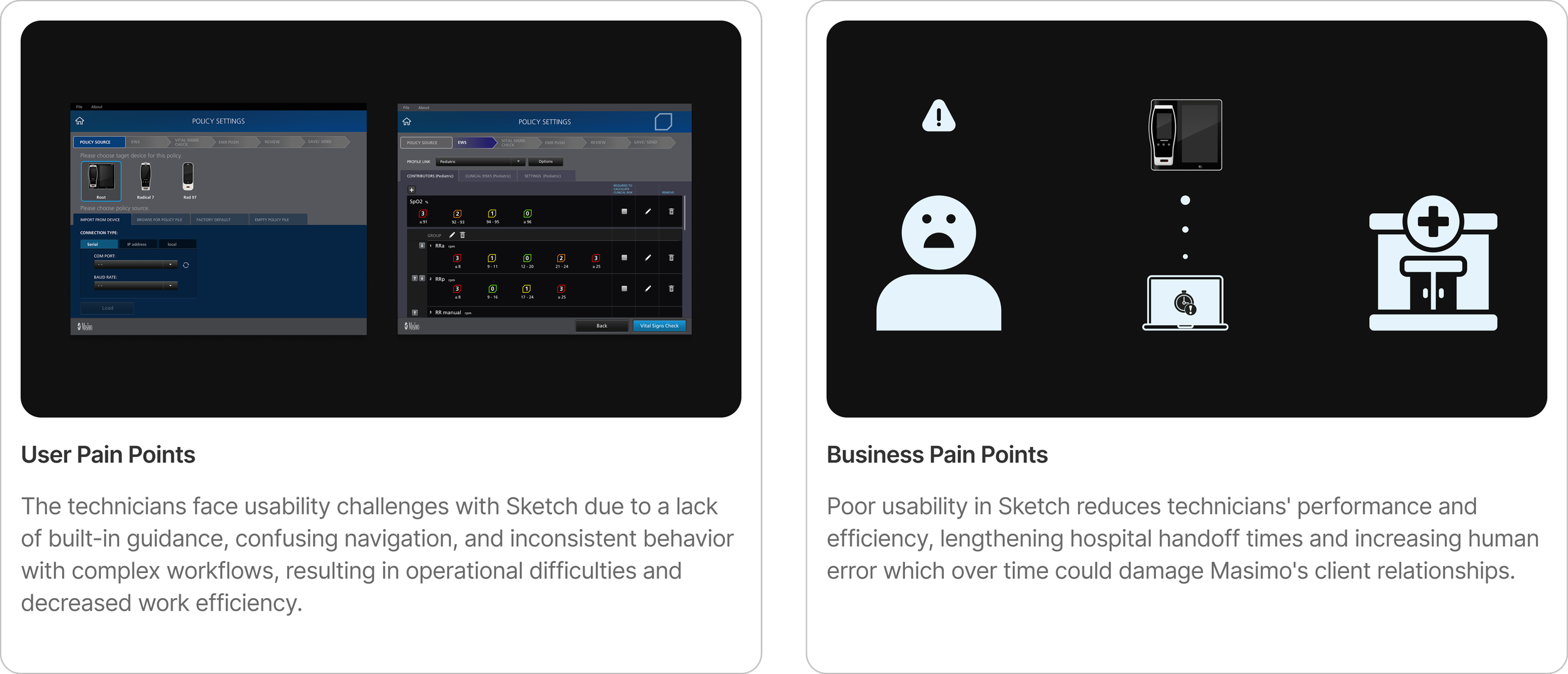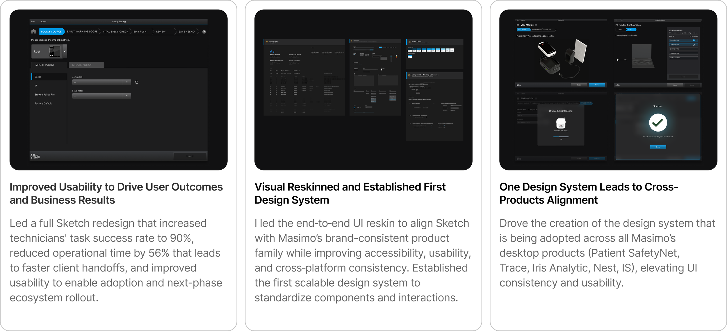Sketch redesign aims to enhance the overall user experience by reducing the learning curve and boosting user’s work efficiency. Its goal is to increase task success rates and shorten operation times, enabling faster hospital delivery with configured devices, thereby strengthening client relationships and trust in Masimo.